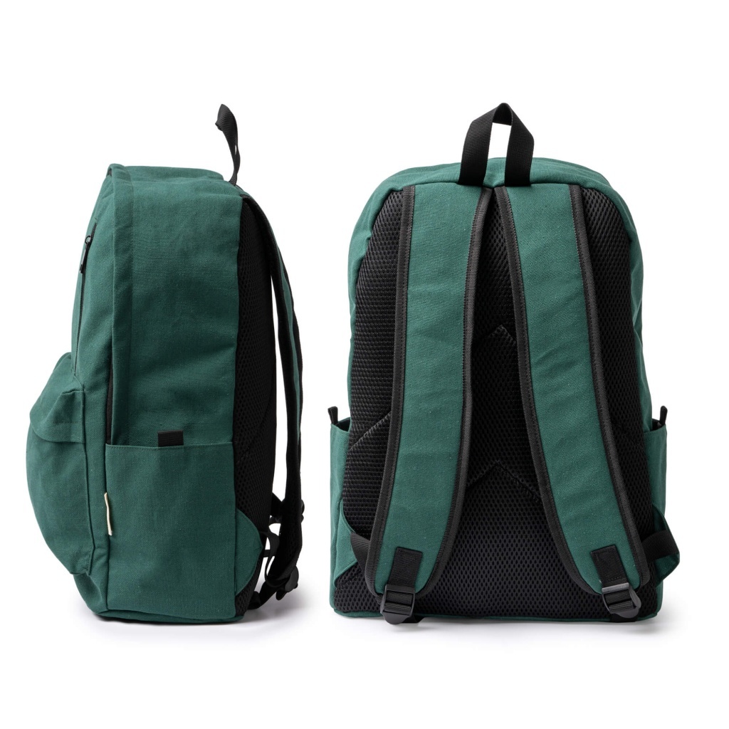 Durable backpack crafted from 330 gsm recycled cotton featuring a spacious main compartment with an interior pocket sized for a 15" laptop, two zippered exterior pockets, two side pockets, and padded handles and back for comfortable carrying.