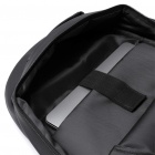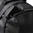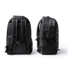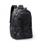 PU leather backpack featuring reflective accents. Large-capacity main compartment includes an interior pocket sized for a 17-inch laptop. Front panel has elastic drawstrings and there is a side pocket. Adjustable, padded handles and a padded back. Capacity: 20l