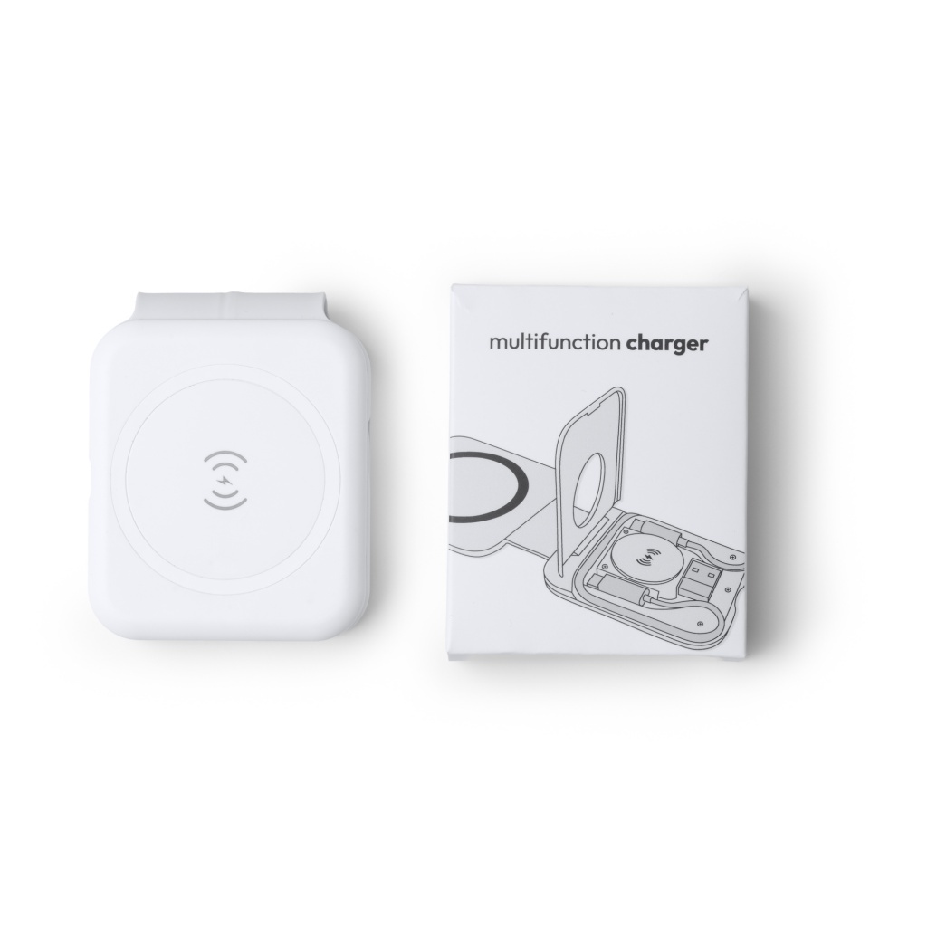 Foldable 3-in-1 wireless charger delivering 15 W. Ideal for travel, it includes charging stations for smartphones, wireless earbuds, and smartwatches. USB Type-C cable with USB Type-C/USB A adapter included.
