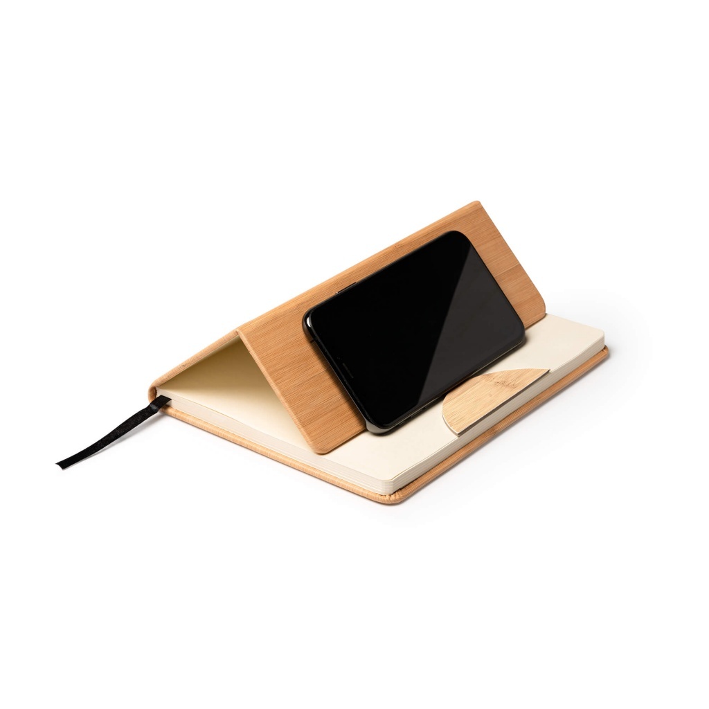 A5 notebook. This A5 notebook features bamboo hard covers with a phone stand function, a sewn-in bookmark and 80 lined pages for organized note-taking.