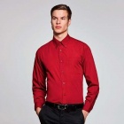 Long sleeve shirt with a classical starched one-button collar. Features a left front pocket, flap with 7 matching buttons and a curved hem. Easy care finish.