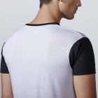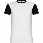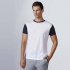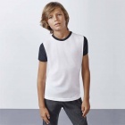 Short-sleeve T-shirt with a rounded collar trimmed in black. The black sleeves are crafted from the same material. Made from a polyester fabric with a cotton-like hand feel.