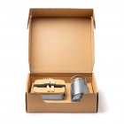 Lunch box constructed from 304 stainless steel with an 800 ml capacity, featuring a bamboo lid and an elastic safety band. Included bamboo cutlery. Bottle made of 304 stainless steel with a 500 ml capacity.