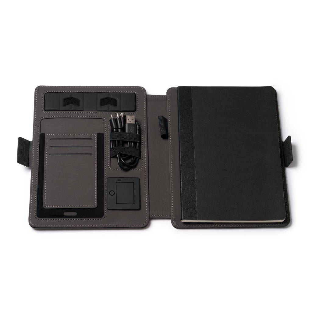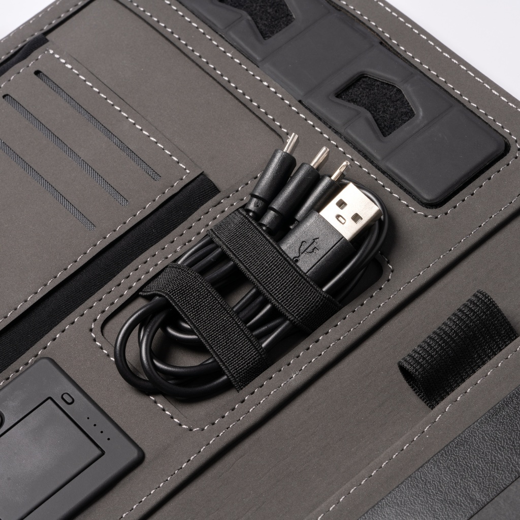 Inside, the folder includes a removable notepad with 56 sheets and a dedicated compartment to store and protect your mobile phone. Additional features include a card holder, a mobile phone holder, and a pen holder to ensure a writing instrument is always available. A cable with 3 inputs (type C and USB output) is included to support charging across multiple device types.