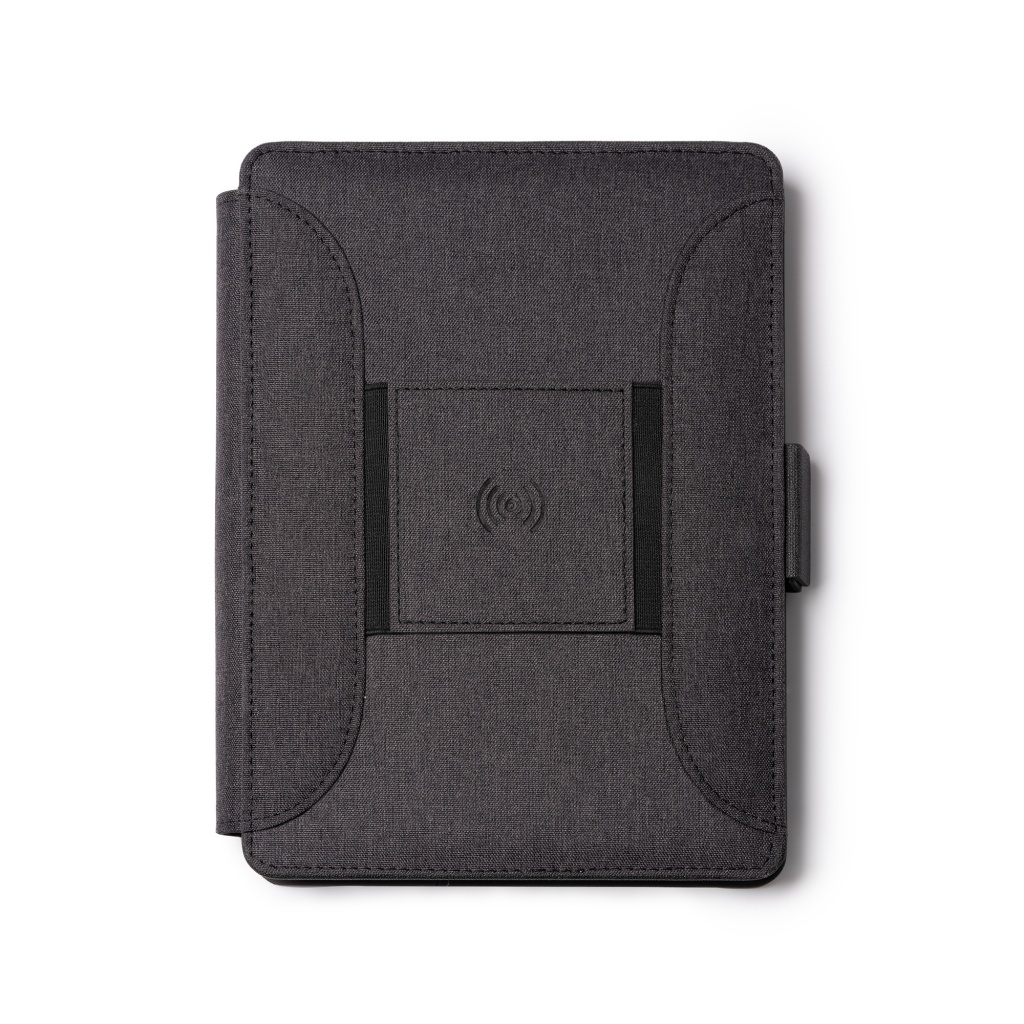 Equipped with a magnetic closure, the folder secures documents and personal items inside. The lid houses a built-in wireless charger, providing convenient wireless power for compatible devices.