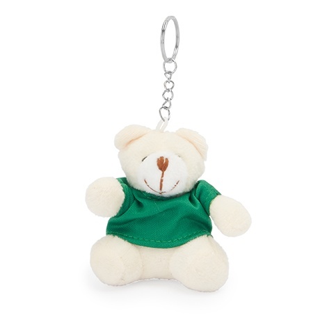 Soft polyester teddy bear keyring wearing a coloured t-shirt.