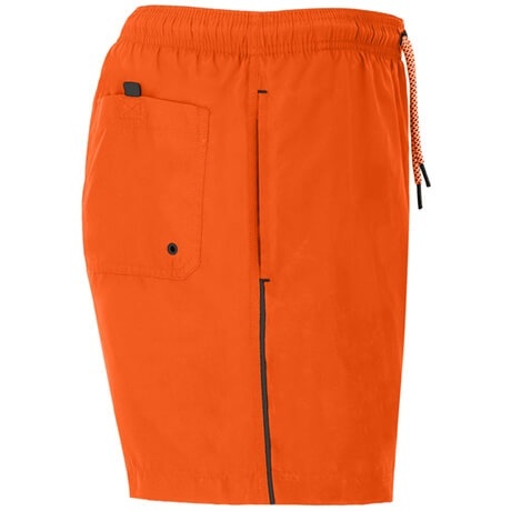 Swim trunks featuring two side pockets. Elastic waistband with adjustable decorative laces and metal eyelets for contrast. Ribbed side panels for shaping. Back pocket fitted with a drain eyelet.
