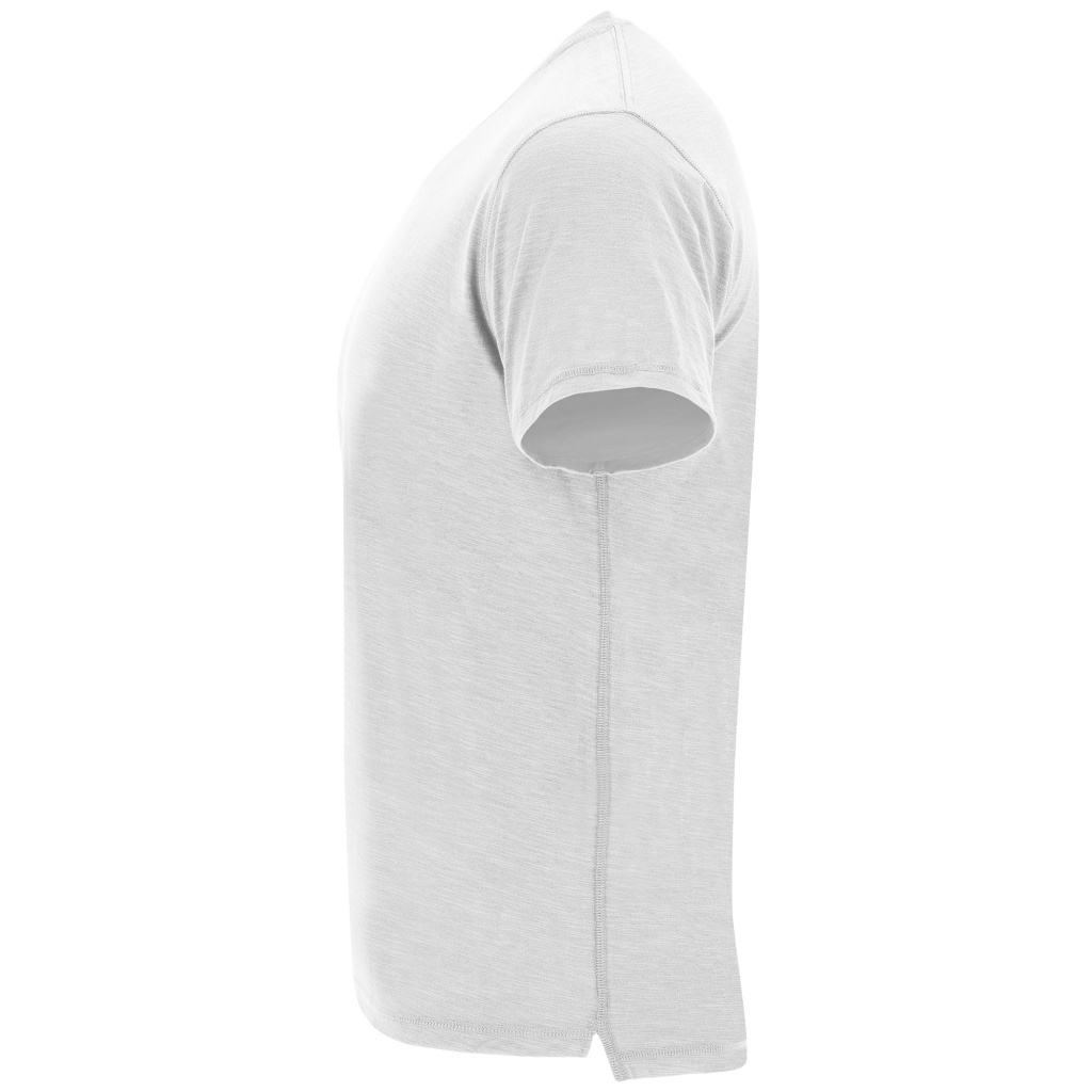 T-shirt with short sleeves, made of vigore fabric. Round neckline from the same fabric. Internal contrasting seams from the shoulders. Decorative side seams with side slits. The back part is slightly longer than the front.