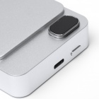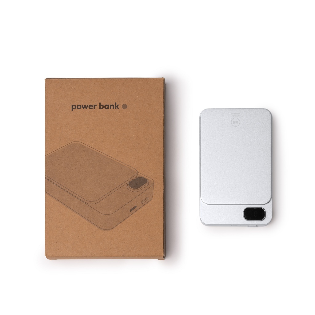 Magnetic powerbank with 10000 mAh capacity and wireless charging capability. Features a screen that displays the charge level and a recycled aluminum body for a sustainable finish.