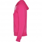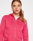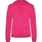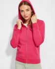 Woman´s hooded jacked with hood lined to tone. Front metal zip and kangaroo pocket. Reinforced covered seams in collar. 2x2 rib knit in cuffs and waist. Fitted cut.