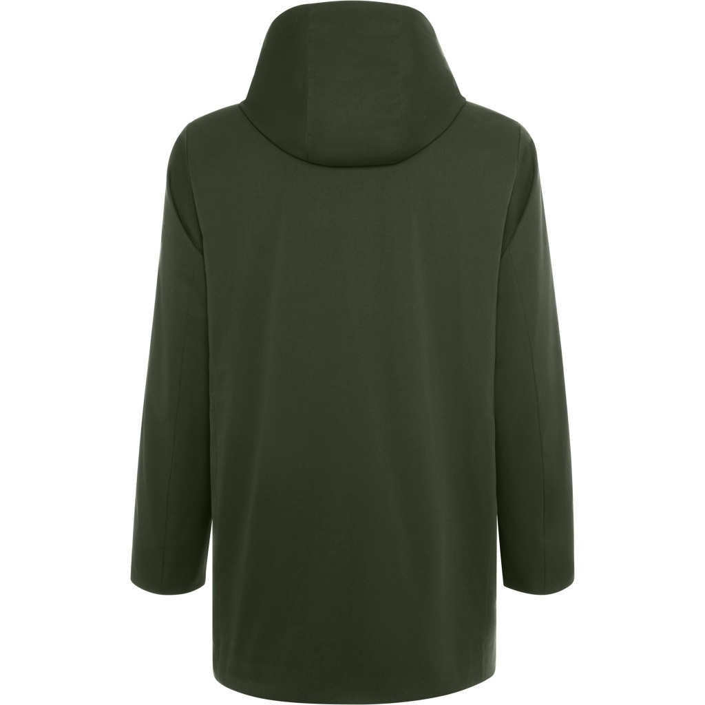 Padded 3/4 parka featuring a high collar and a detachable hood with a zipper for versatile wear. The front has a two-way zipper concealed by a flap with a snap fastener, plus two side pockets with flaps and snap fasteners and an inner pocket with an invisible zipper closure. Access to further production processes on the back adds functional detail.
