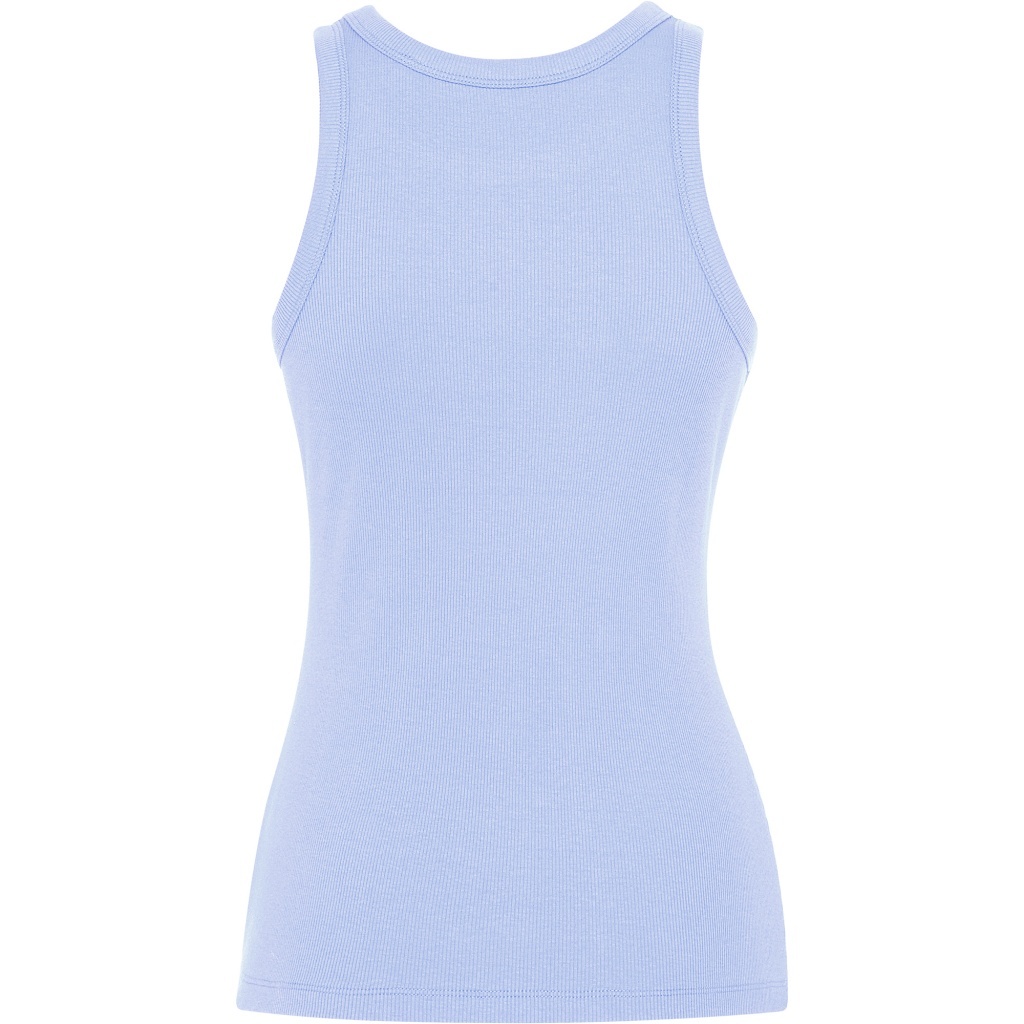 Women's ribbed tank top. Collar and shoulder feature cutouts with wide trim in the same fabric, reinforced with double stitching. Double stitching at the hem.