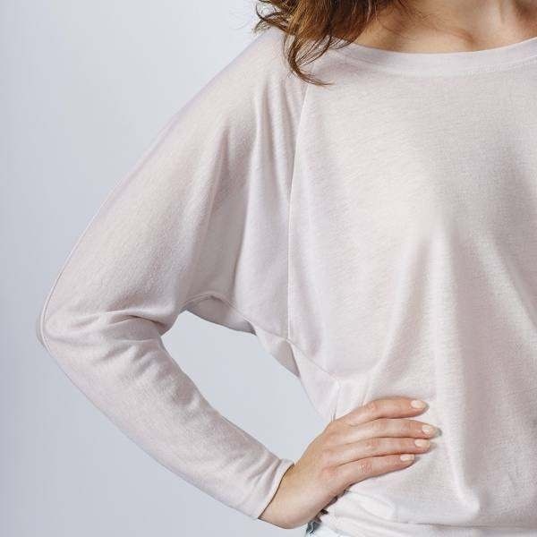 Oversize long-sleeve t-shirt with an open neckline and raglan batwing sleeves for a relaxed yet stylish look.