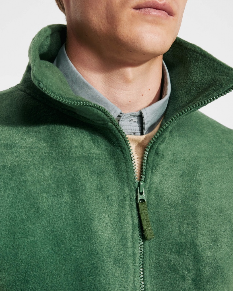Fleece vest with high collar and matching-tone zipper. Side pockets with matching-tone zippers.