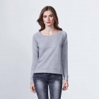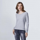 Bluza damska z raglanowymi długimi rękawami i zaokrąglonym dekoltem wykończonym lamówką 1x1. Ozdobne przeszycie pod szyją oraz szerokie mankiety i pas wykończone lamówką 1x1.