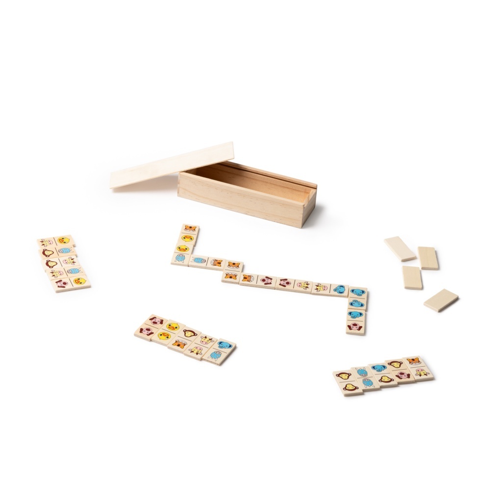 Drewniane domino z motywem zwierząt, składające się z 28 elementów. Zestaw zapakowany w praktyczne drewniane pudełko.