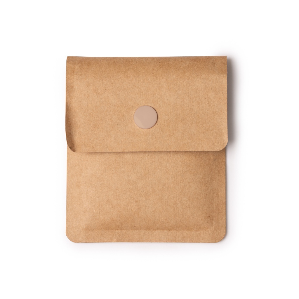 Popielniczka z papieru pochodzącego z recyklingu, wyposażona w aluminiową warstwę ognioodporną. Zamykana na guziki.