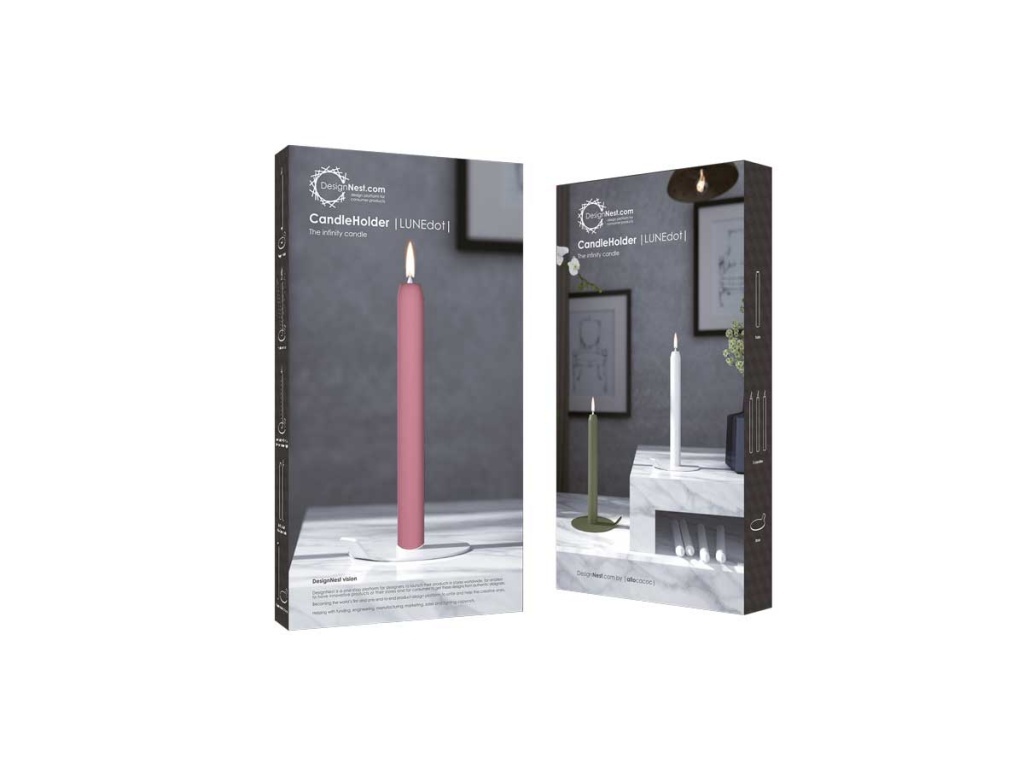 To świeca i świecznik w jednym, wyposażone w przemyślaną technologię. LUNEdot to stalowa rurka w kształcie świecy z wbudowaną sprężyną dociskową. Do rurki wkładasz prawdziwą świecę i przytwierdzasz ją sprężynką. Dzięki temu świeca jest stopniowo wypychana ku górze w trakcie palenia i nigdy nie pozostanie brzydki, wypalony kikut na stole. Na dole rękawa na świecę znajduje się magnes. Zatrzaskuje on tuleję ze świecą na stalowej płycie podstawy. Ten magnes pełni także funkcję praktyczną. Zapewnia, że ustawisz podstawę idealnie równo. Dzięki temu świeca pali się wydajnie — wystająca z tuby część oznacza nieszczelność i utratę „paliwa”. Jak to działa: włóż świecę do zewnętrznej tuby, sprężynę do wewnętrznej, zsuń oba elementy razem i dokręć nakrętkę z gwintem i magnesem. Kliknij dolną płytkę i gotowe! Rdzeń jest całkowicie schowany wewnątrz i wysuwa się, gdy świeca się wypala. Stojak składa się z 2 oddzielnych części. Rękaw i podstawa. Są one połączone za pomocą magnesu. Dzięki temu możesz dowolnie miksować i dopasowywać świeczniki oraz podstawy.