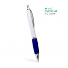 Antybakteryjny długopis wykonany z ABS, poddany obróbce jonami srebra (technologia nano srebra). Zapobiega i hamuje rozwój bakterii na korpusie długopisu. Wyprodukowano zgodnie z normą ISO 22196: 2011. Kolorowy gumowy uchwyt o półprzezroczystym wykończeniu. Niebieski atrament.