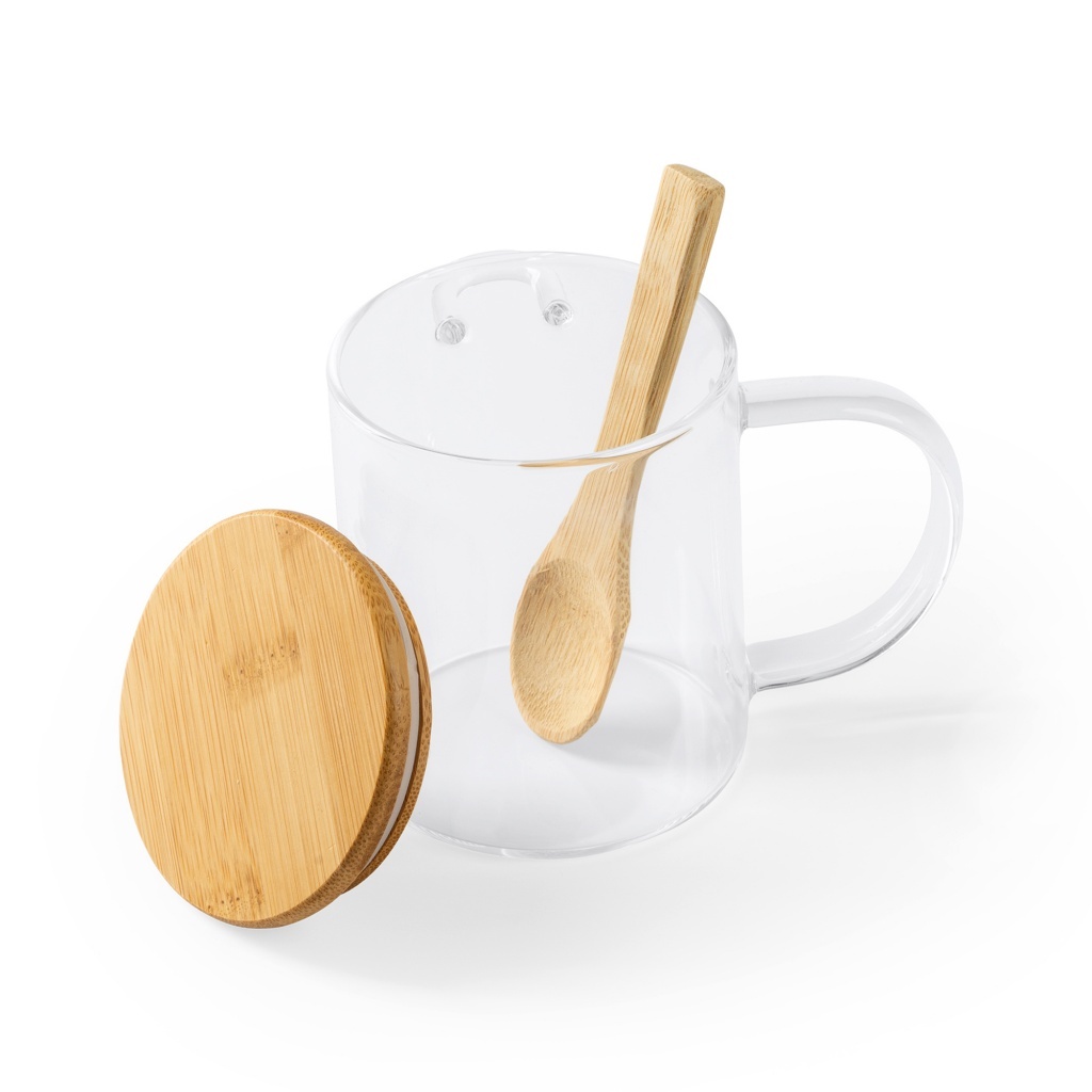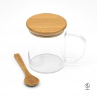 Elegancki szklany kubek z bambusową pokrywką i dopasowaną łyżeczką — idealny do codziennego użytku i jako ekologiczny upominek. Doskonały do gorących napojów dzięki trwałemu szkłu borokrzemianowemu.