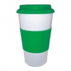 Stalowy kubek termiczny z silikonową opaską zapewnia pewny chwyt oraz wygodę użytkowania.