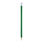 Okrągły, drewniany ołówek wyposażony w gumkę.