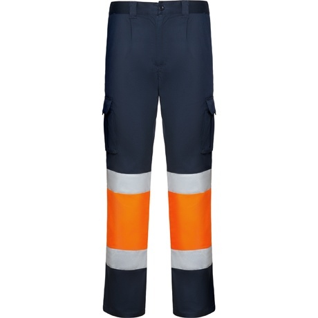 Długie spodnie robocze z licznymi kieszeniami, dobrze widoczne z daleka.