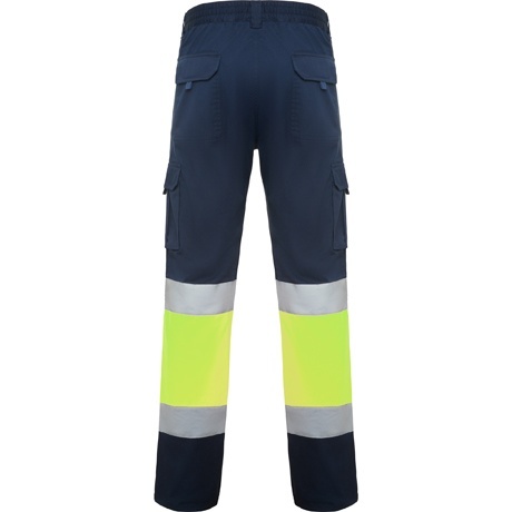 Długie spodnie robocze z licznymi kieszeniami, dobrze widoczne z daleka.