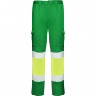 Długie spodnie robocze z licznymi kieszeniami, dobrze widoczne z daleka.