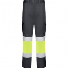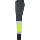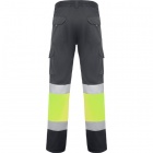 Długie spodnie robocze z licznymi kieszeniami, dobrze widoczne z daleka.