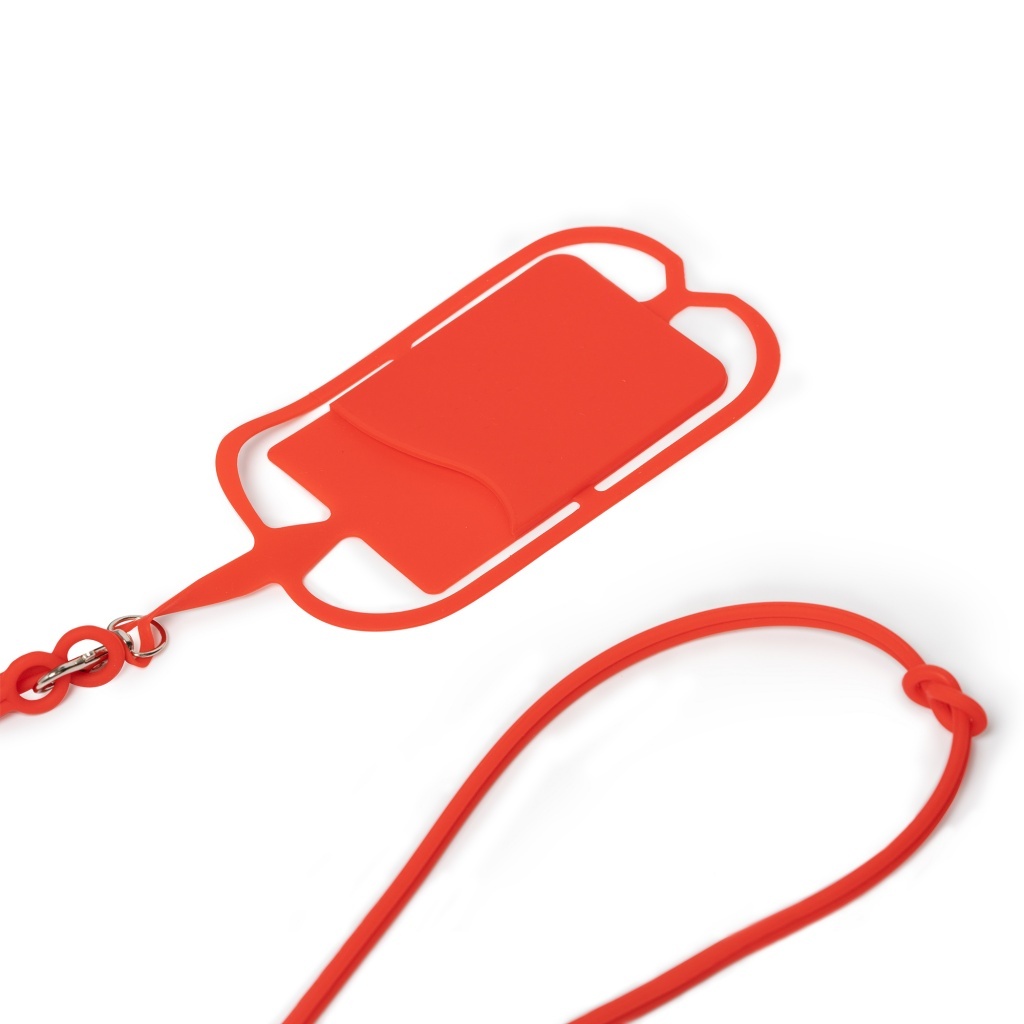 Silikonowa smycz z uchwytem na telefony komórkowe oraz kieszonką na karty płatnicze.