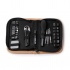 Zestaw narzędzi zawierający 25 elementów — nóż, klucz sześciokątny, śrubokręt krzyżakowy i płaski, narzędzie mocujące oraz miara o długości 100 cm. Zapakowane w etui z korka i pudełko zaprojektowane z myślą o środowisku.