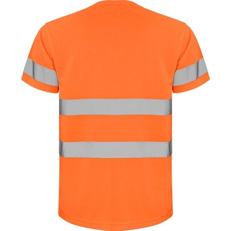 Techniczna koszulka z krótkim rękawem zapewniająca wysoką widoczność. Okrągły dekolt wykonany z tej samej tkaniny z wzmocnionymi szwami. Dwie poziome taśmy odblaskowe na środku oraz pojedyncze taśmy na rękawkach.