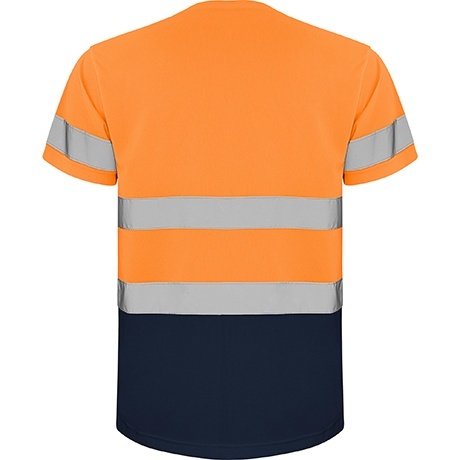 Techniczna koszulka z krótkim rękawem zapewniająca wysoką widoczność. Okrągły dekolt wykonany z tej samej tkaniny z wzmocnionymi szwami. Dwie poziome taśmy odblaskowe na środku oraz pojedyncze taśmy na rękawkach.