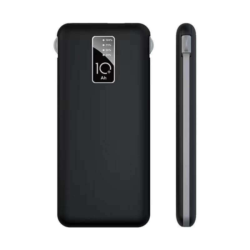 Powerbank o pojemności 10 000 mAh z baterią polimerową o jakości A oraz dwoma zintegrowanymi kablami ze złączami Type-C, micro i lightning zapewni Ci zasilanie w podróży. Dostępny w kolorze białym lub czarnym, waży zaledwie 200g, a jego wymiary to 152*70*15mm (super płaski model). Istnieje możliwość nadruku Twojego logo lub tekstu na urządzeniu; produkt zostanie dodatkowo zapakowany w estetyczne pudełko prezentowe.