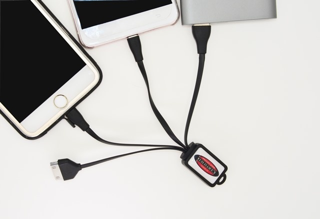 DOMEY to zestaw kabli do ładowania 4 w 1 wyposażony w złącza micro USB, USB typu C, Lightning oraz standardowy wtyk USB. Produkt umożliwia personalizację uchwytu poprzez pełnokolorowy nadruk, co pozwala na wykonanie spersonalizowanego zestawu już od 100 sztuk.