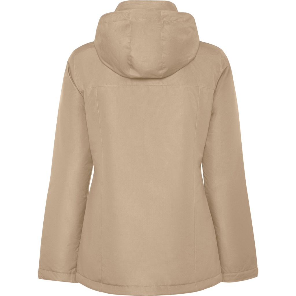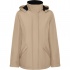 Damska wodoodporna kurtka typu parka z pikowaną podszewką, zaprojektowana z myślą o ochronie przed wiatrem i deszczem. Posiada wysoki kołnierz ze zwijanym kapturem z kieszenią na kaptur zapinaną na rzep, zamek dopasowany kolorem do klapy oraz boczne kieszenie kryte klapami i zamkami. W środku znajduje się wewnętrzna kieszeń zapinana na rzep, regulowane mankiety na rzep oraz wewnętrzny dostęp do wzmocnień na plecach i lewej piersi.