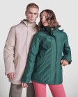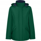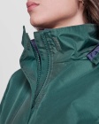 Damska wodoodporna kurtka typu parka z pikowaną podszewką, zaprojektowana z myślą o ochronie przed wiatrem i deszczem. Posiada wysoki kołnierz ze zwijanym kapturem z kieszenią na kaptur zapinaną na rzep, zamek dopasowany kolorem do klapy oraz boczne kieszenie kryte klapami i zamkami. W środku znajduje się wewnętrzna kieszeń zapinana na rzep, regulowane mankiety na rzep oraz wewnętrzny dostęp do wzmocnień na plecach i lewej piersi.