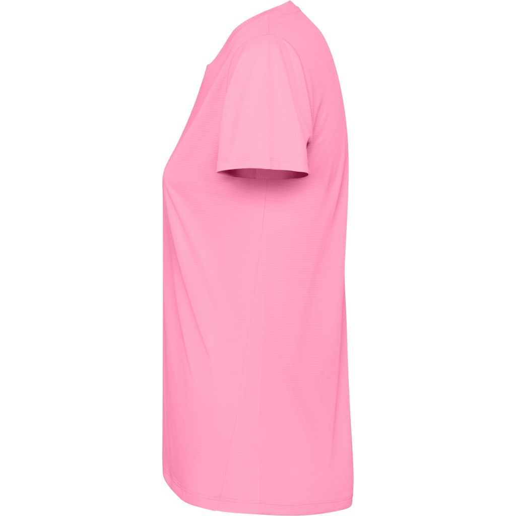 Damska, dopasowana koszulka techniczna z krótkim rękawem. Szyte szwy w kołnierzu pokryte w tym samym kolorze. Tył koszulki jest nieco dłuższy niż przód, a boczne szwy przesunięto do przodu, co poprawia dopasowanie.