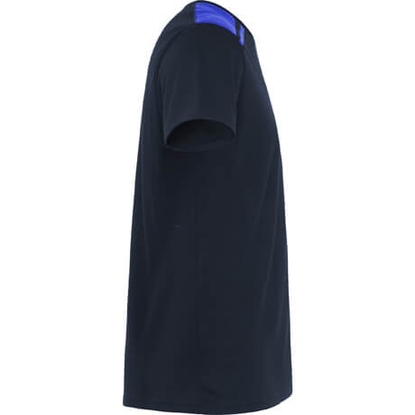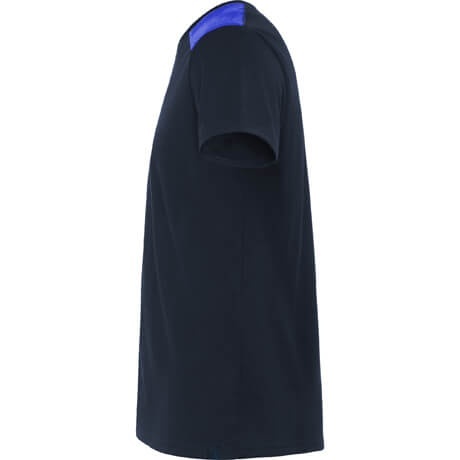 Kolorowa koszulka z krótkim rękawem, z okrągłym dekoltem wykończonym kontrastową wewnętrzną obwódką. Kontrastowe wstawki na ramionach oraz dopracowane detale.