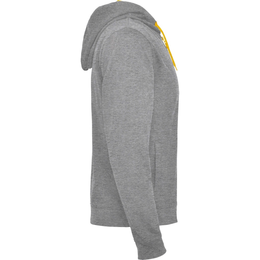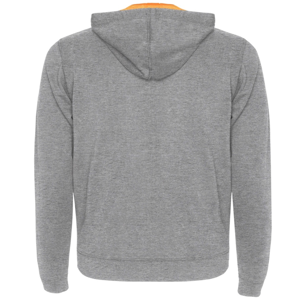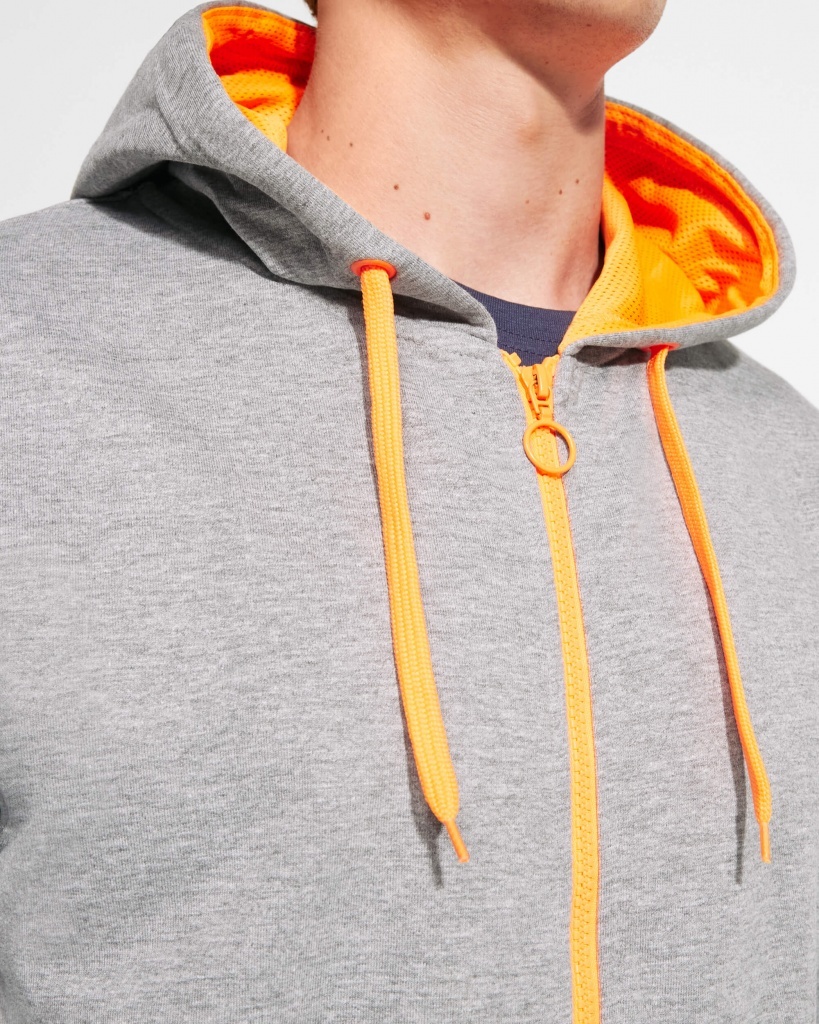 Rozpinana bluza z fluorescencyjnymi akcentami. Kaptur ma podszewkę z mikro perforowanej tkaniny poliestrowej w kontrastującym fluorescencyjnym kolorze. Sznurek i metalowe oczka również w fluorescencyjnym kolorze. Prążkowane mankiety i dół bluzy 1x1.