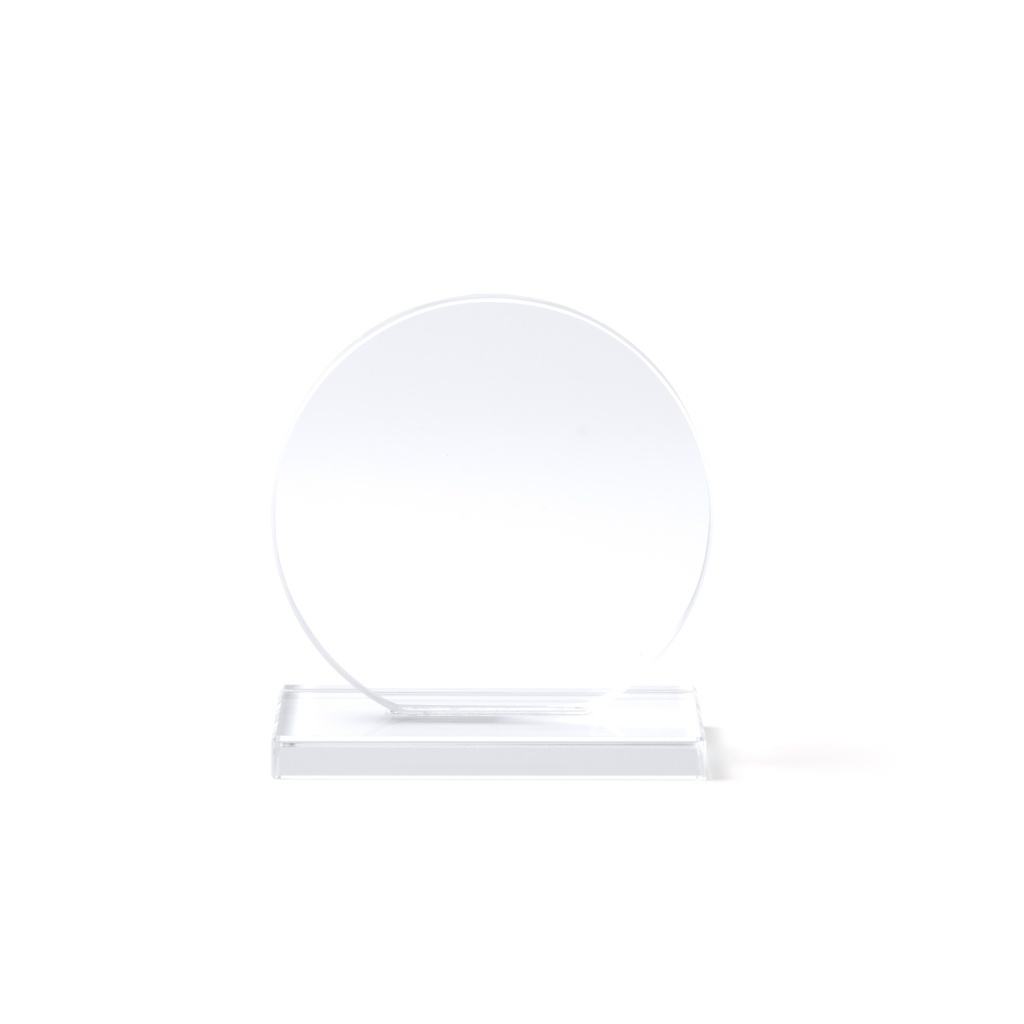 Eleganckie szklane trofeum w formie koła osadzone na prostokątnej podstawie. W zestawie czarne etui.