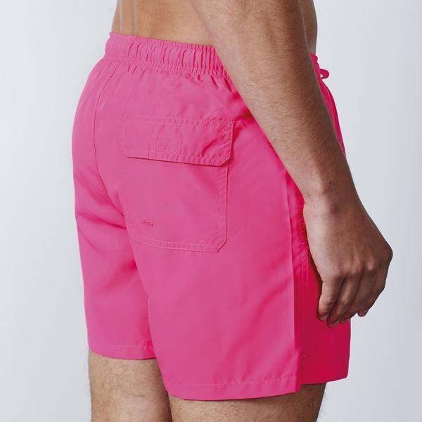 Kąpielówki z dwiema kieszeniami bocznymi. Regulowany ściągacz w dopasowanym kolorze, tylna kieszeń z napą. Boczne rozcięcia oraz podwójne szwy w kolorze dopasowanym do tkaniny.