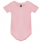 Body z krótkim rękawem dla niemowląt, tkanina single jersey. Okrągły dekolt wykończony lamówką 1x1. Zapięcie w kroku na zatrzaski.