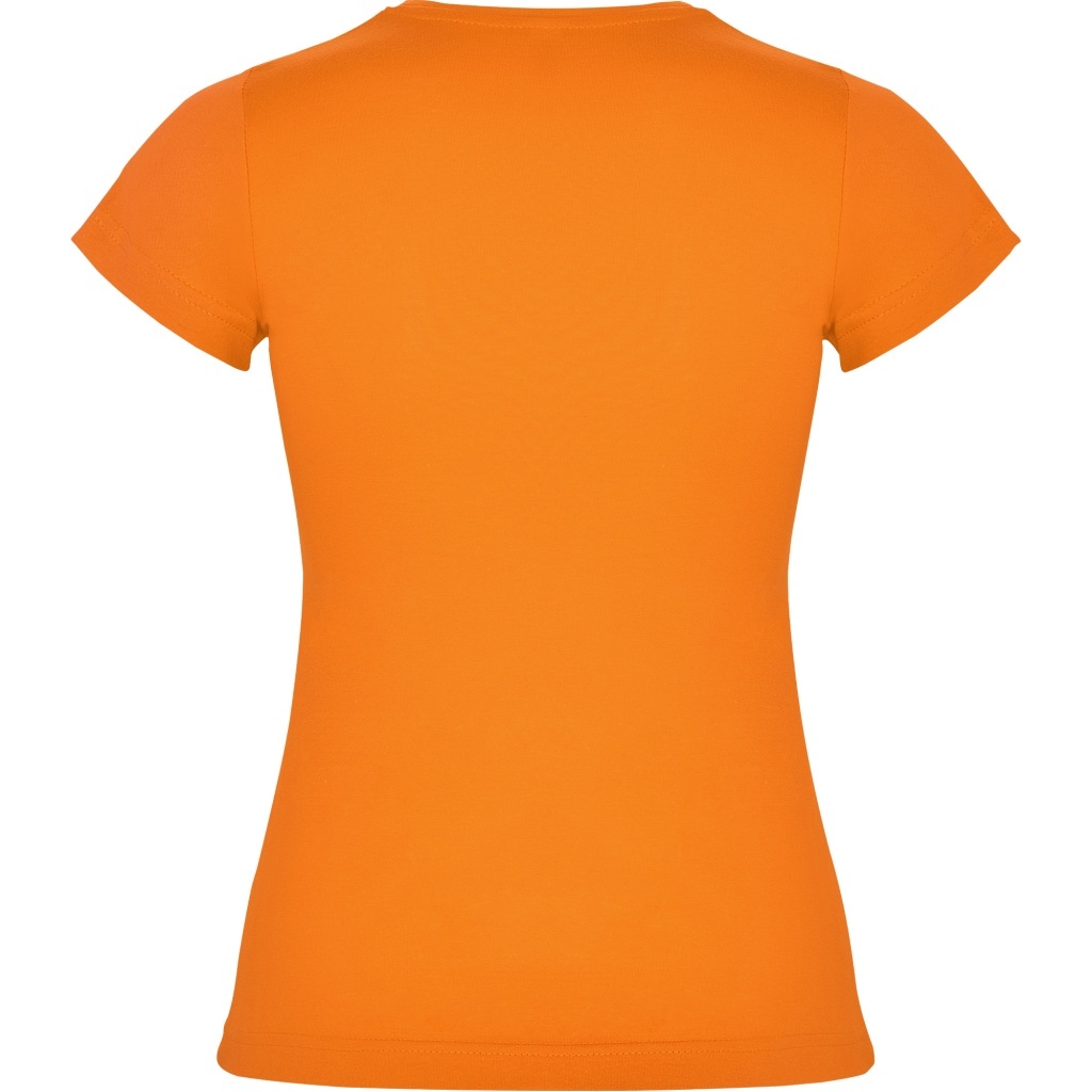 Dopasowana koszulka damska. Zaokrąglony, dwuwarstwowy ściągacz przy szyi, typowo damski fason. Wzmocnione, kryte szwy przy kołnierzyku i na ramionach, szwy boczne.