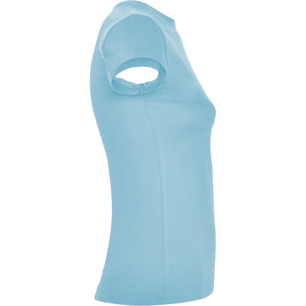 Dopasowana koszulka damska. Zaokrąglony, dwuwarstwowy ściągacz przy szyi, typowo damski fason. Wzmocnione, kryte szwy przy kołnierzyku i na ramionach, szwy boczne.
