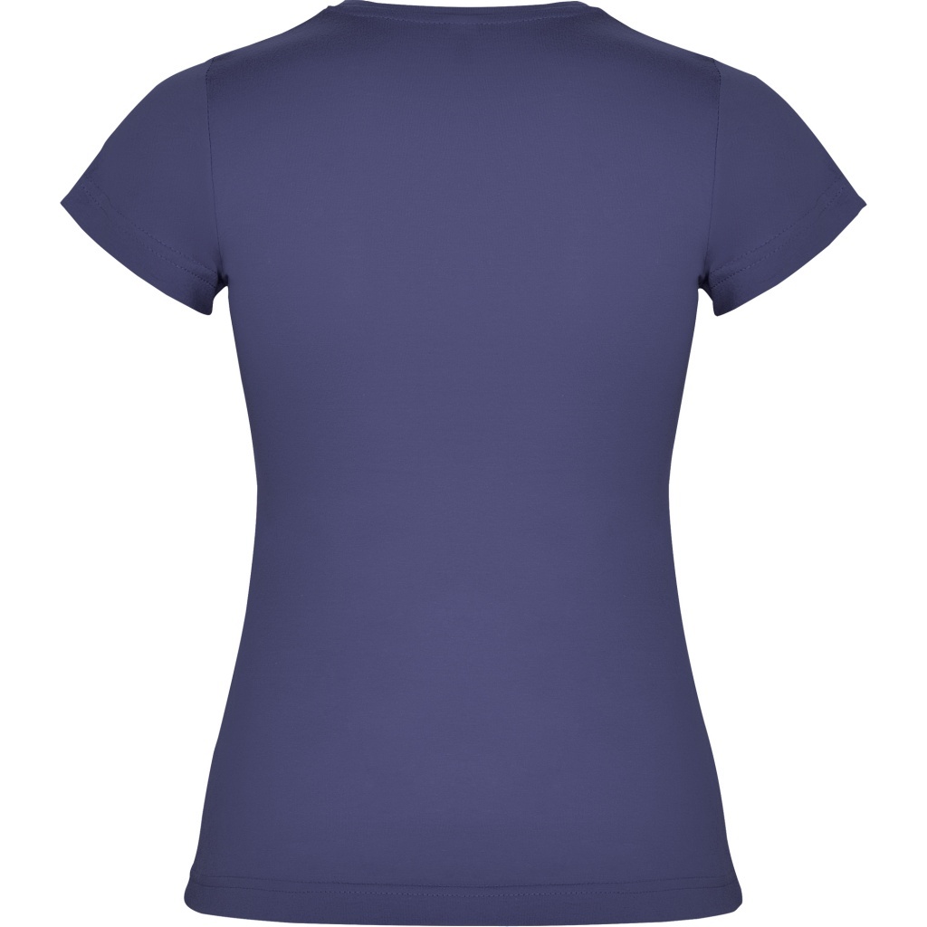 Dopasowana koszulka damska. Zaokrąglony, dwuwarstwowy ściągacz przy szyi, typowo damski fason. Wzmocnione, kryte szwy przy kołnierzyku i na ramionach, szwy boczne.