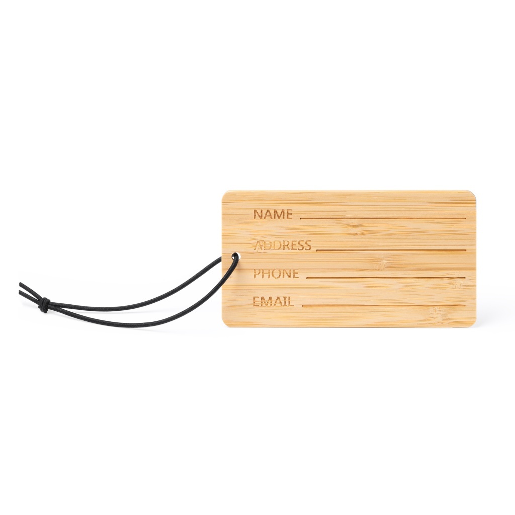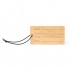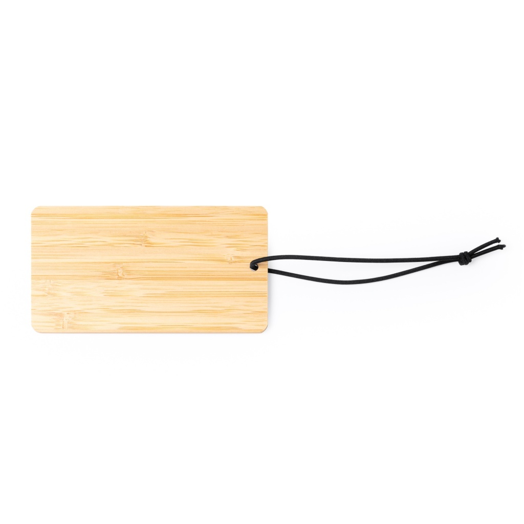 Zawieszka do walizki z bambusa, wyposażona w czarny elastyczny pasek.