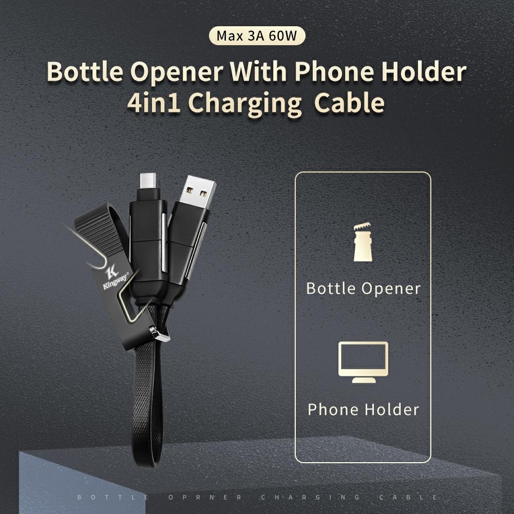 Wielofunkcyjny kabel do szybkiego ładowania i wymiany danych z dodatkową funkcją podstawki pod telefon oraz otwieracza do butelek. Długość kabla - 30 cm.