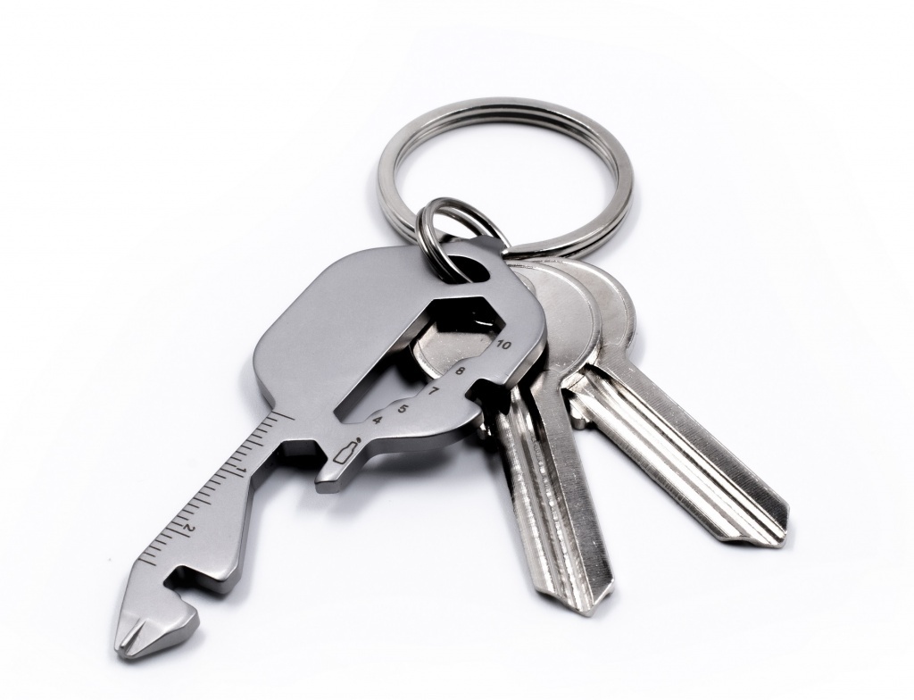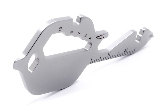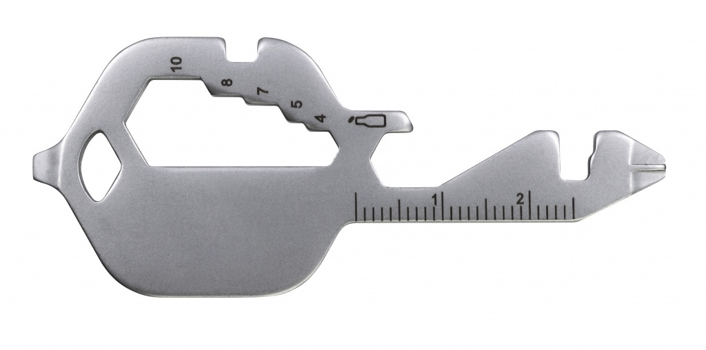 Wielofunkcyjne narzędzie ze stali nierdzewnej, skonstruowane w formie klucza.